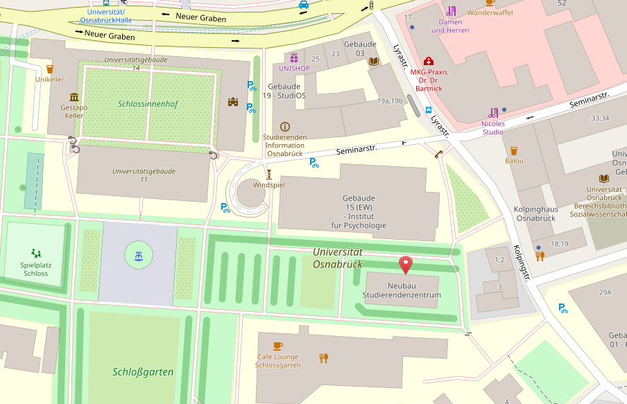 The self-help workshop is located in the student centre (building 53 – between the Schlossmensa and the EW building) with the adress Kolpingstraße 1a, 49074 Osnabrück