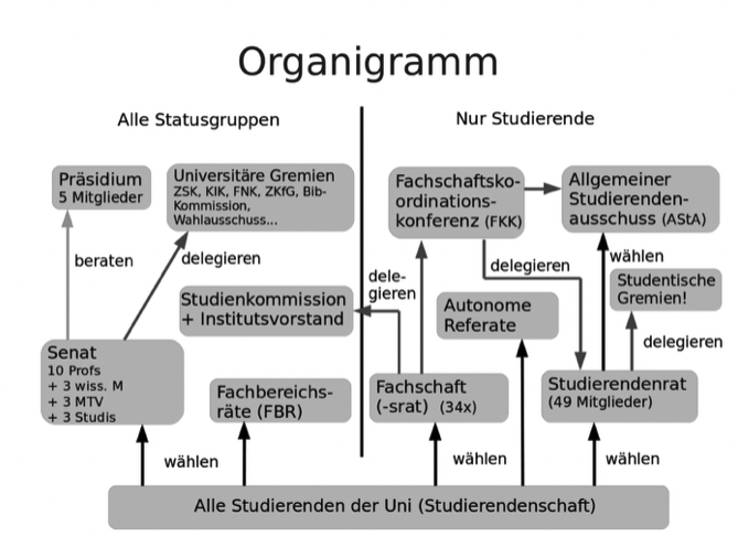 Um aber erst einmal zu verstehen, wie die Hochschulpolitik grob aufgebaut ist, ist hier ein Organigramm: